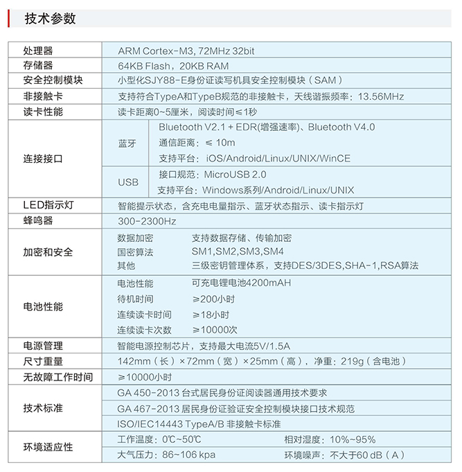 IDR240產(chǎn)品內(nèi)置公安部授權(quán)的小型化SJYY88-E身份證讀寫機具安全控制模塊(SAM)和藍牙模塊,可讀取居民身份證信息,通過藍牙或USB接口上傳到計算機進行解碼,實現(xiàn)居民身份證的有效性驗證、存儲、查詢和打印,支持核查名單提示。可對接各類業(yè)務(wù)系統(tǒng),可兼容讀寫其他行業(yè)定制的基于TypeA、TypeB規(guī)范的行業(yè)非接觸卡。內(nèi)置大容量高能鋰電池,支持快速充電,智能電源管理提升續(xù)航能力。