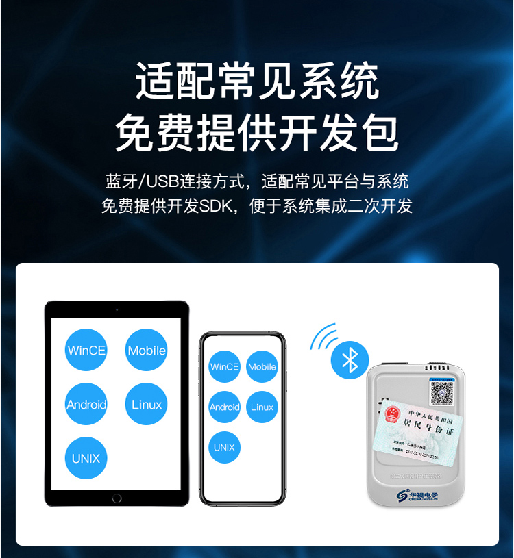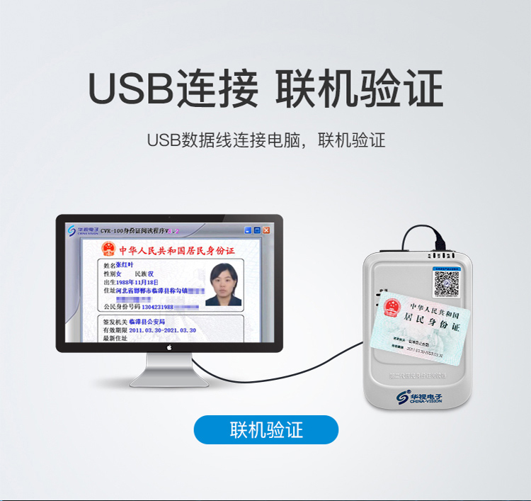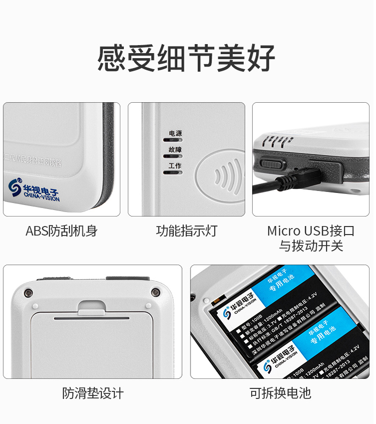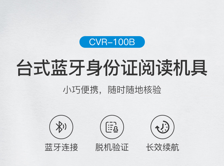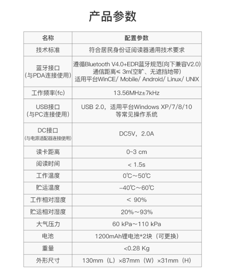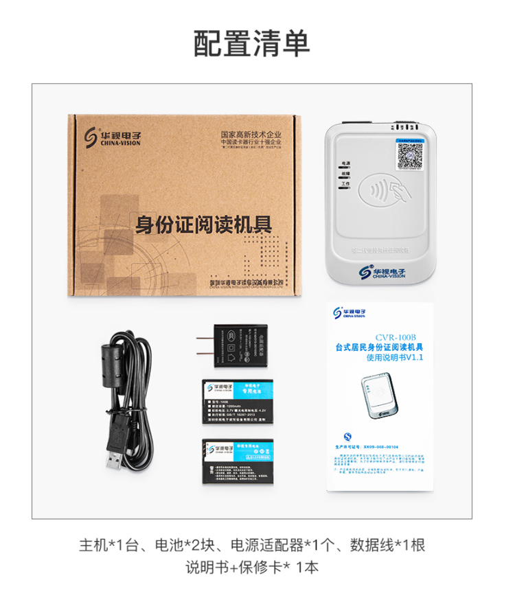 (*由于產品升級或其他原因,華視CVR-100B藍牙身份證讀卡器產品實際參數有可能變更,以實際產品為準。本文中的所有陳述、信息和建議也不構成任何明示或暗示的擔保)